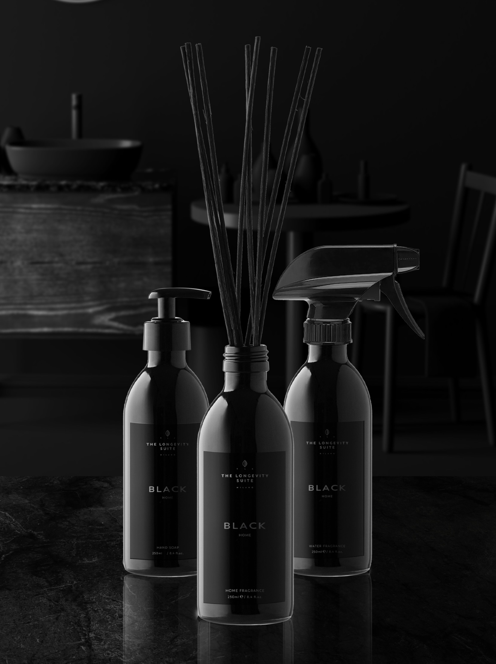 Siyah Ev serisi şunları içermektedir. Ev KokusuSu KokusuEl Sabunu.